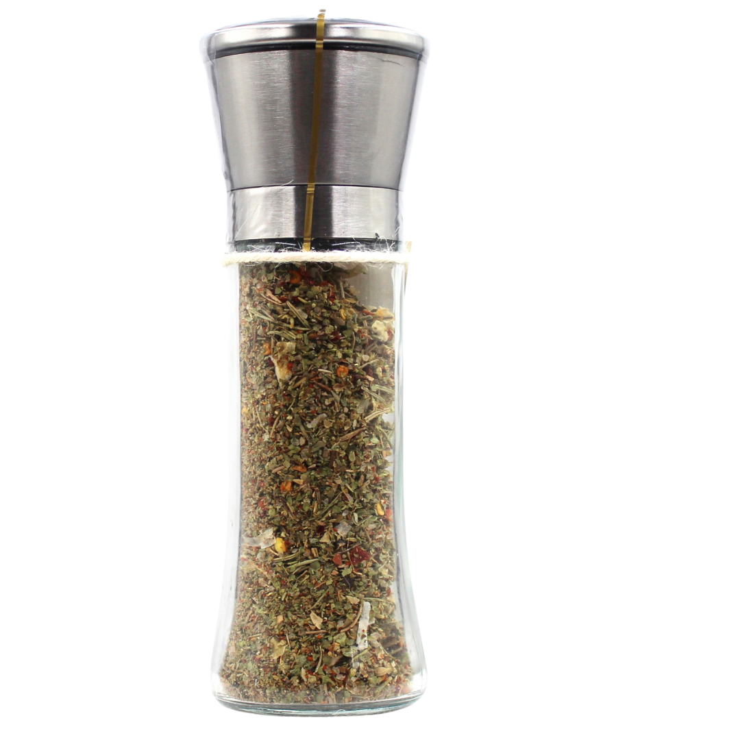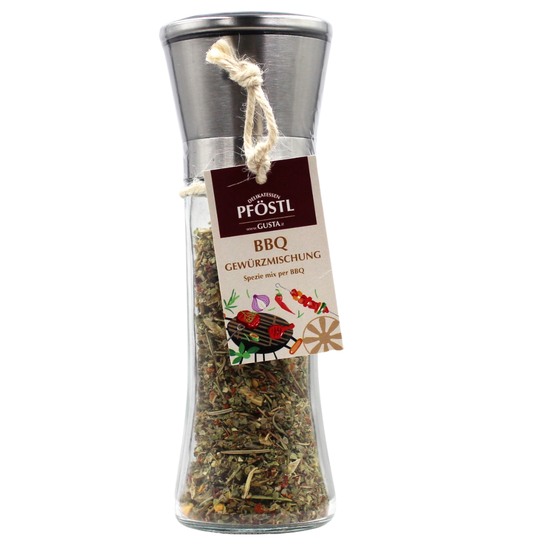 Das BBQ Gewürz kombiniert aromatische Kräuter und Gewürze wie Oregano, Rosmarin, Chili, Zwiebel, Majoran und Salz und verleiht Fleisch, Gemüse oder Marinaden eine harmonische, mediterrane Würze. Die elegante Salzmühle aus Glas mit silbernem Drehkopf sorgt für eine exakte Dosierung und gleichmäßige Körnung. Die Gewürzmischung ist vielseitig einsetzbar und bringt die Aromen von gegrillten oder gebratenen Speisen besonders gut zur Geltung - ideal für alle, die ihre Gerichte mit einer fein abgestimmten, würzigen Kräuternote abrunden möchten.