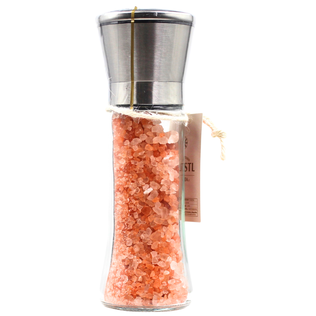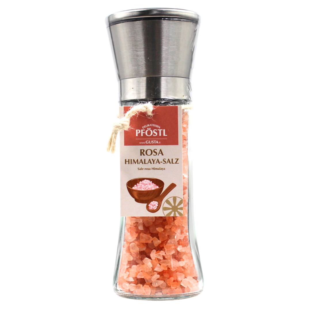 In einer stilvollen Mühle präsentiert sich das Rosa Himalaya-Salz in seiner natürlichen, zartrosa Farbe. Dieses feine Salz ist bekannt für seine Mineralienvielfalt und enthält über 80 Mineralien und Spurenelemente, darunter Magnesium, Kalzium und Eisen, die zum allgemeinen Wohlbefinden beitragen können.