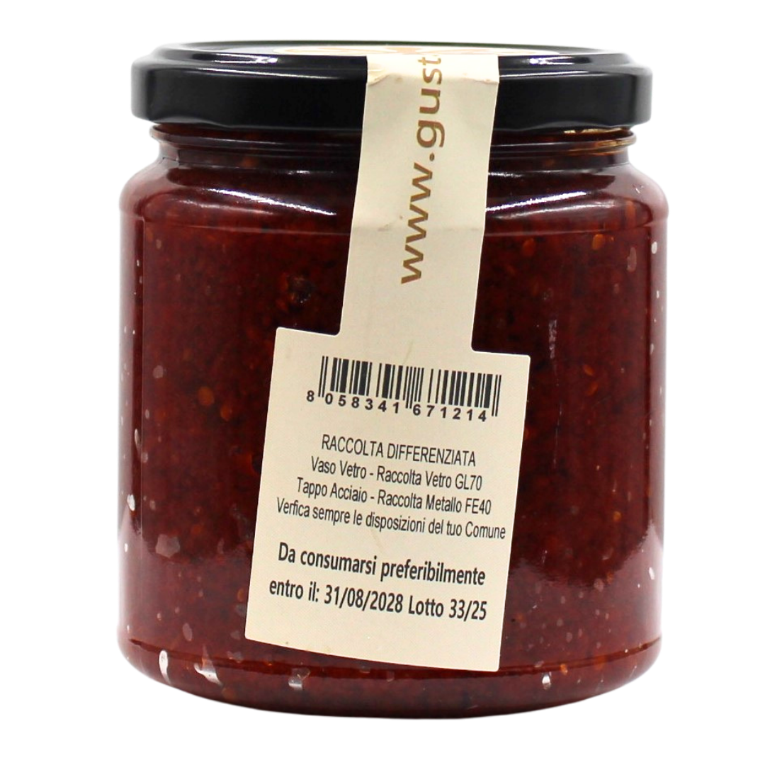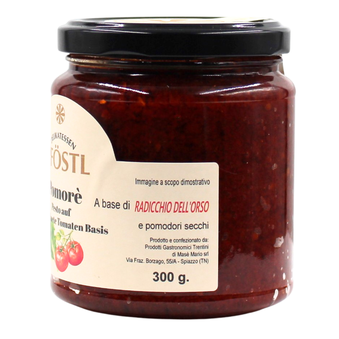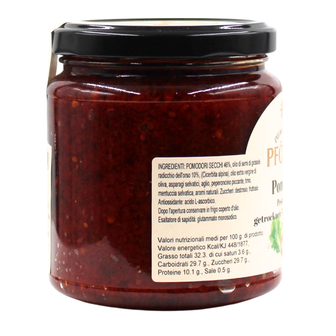 Zutaten: getrocknete Tomaten (enthält Sulfite), Sonnenblumenöl, wilder Chicoree, Extra Vergine Olivenöl, wilder Spargel, Knoblauch, Chili, Thymian, Minze, natürliche Aromen, Zucker (Dextrose, Fructose) Säureregulator: Ascorbinsäure. Geschmacksverstärker: Mononatriumglutamat.