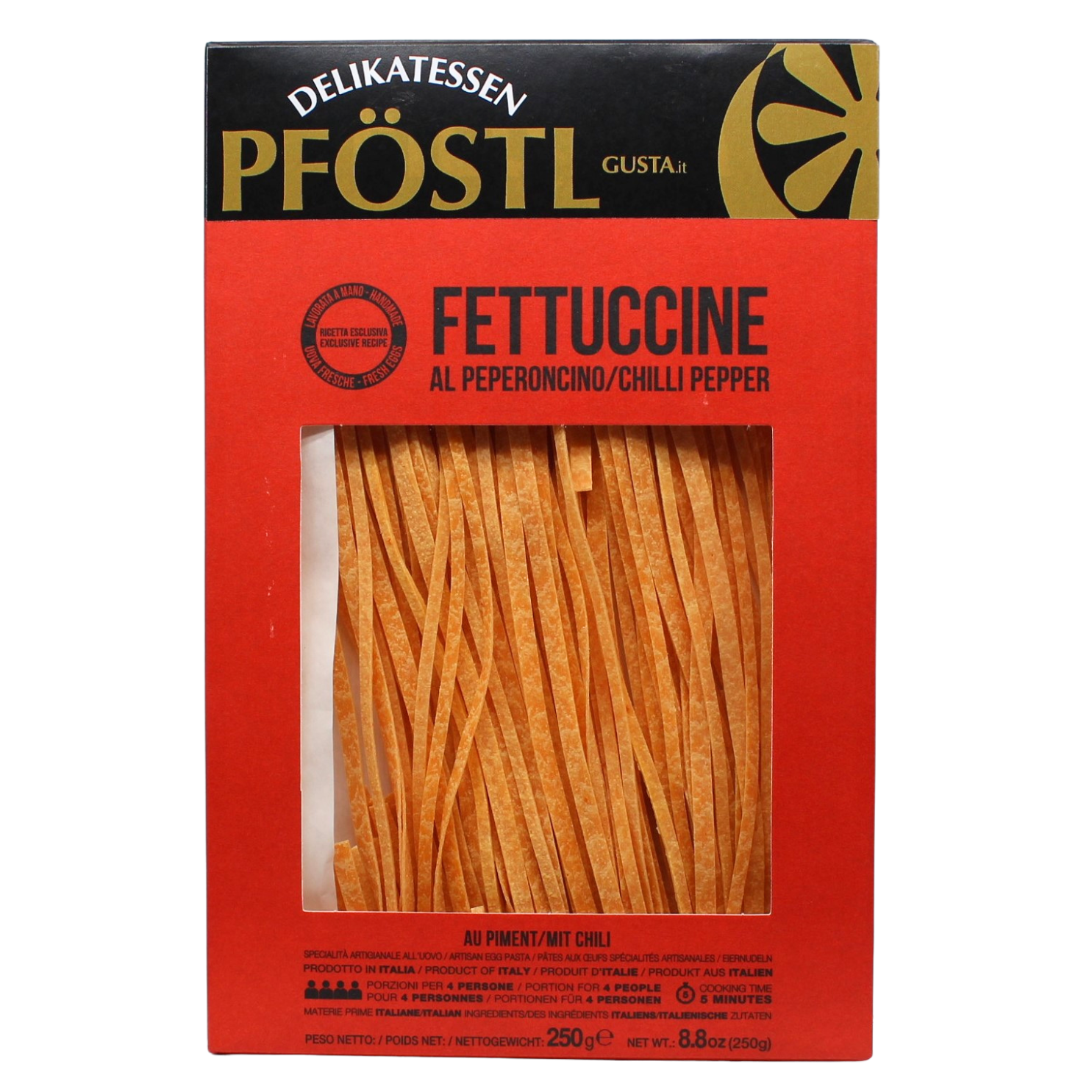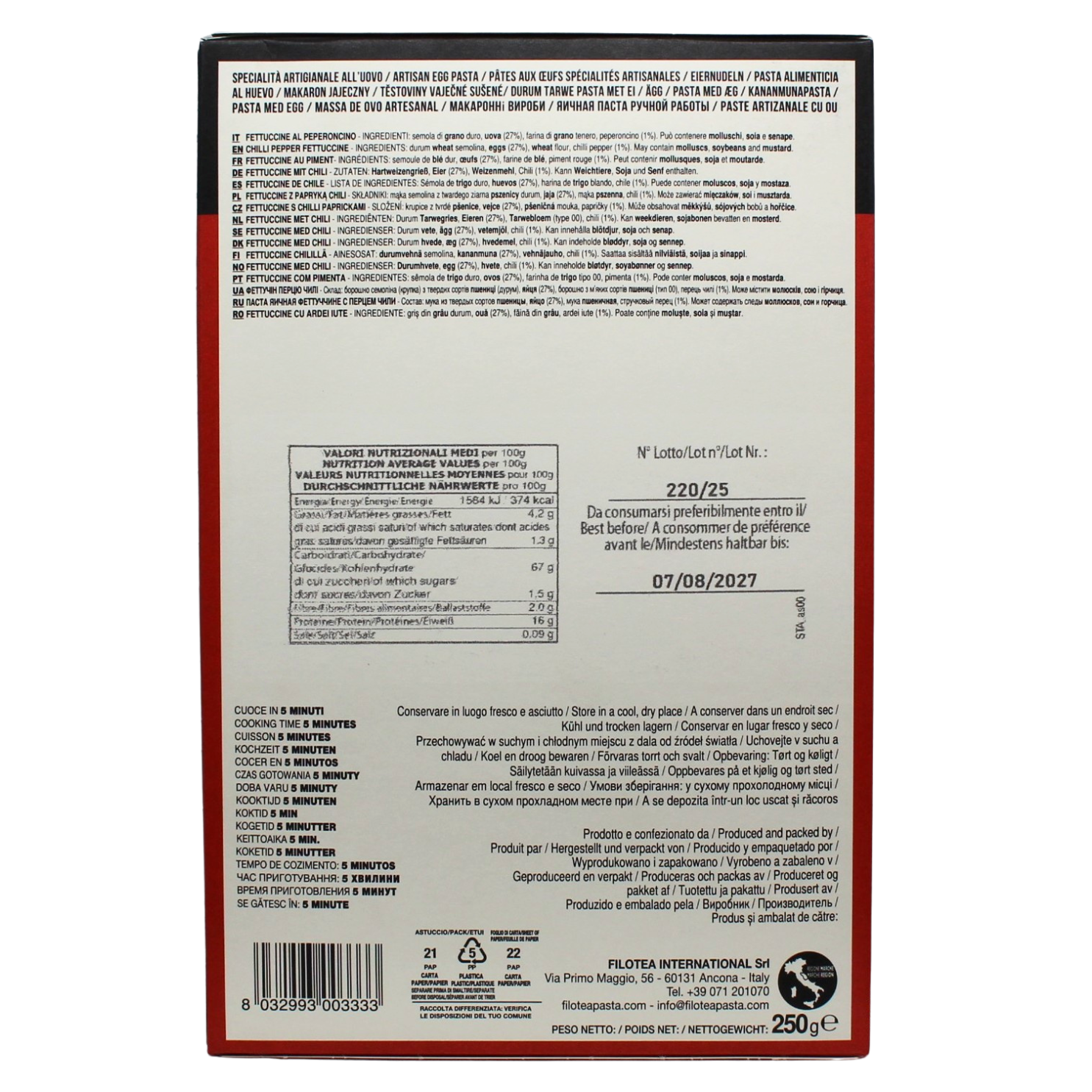Die Fettuccine al Peperoncino werden nach traditioneller italienischer Handwerkskunst hergestellt – ausschließlich mit italienischem Hartweizengrieß, Weichweizenmehl, frischen Eiern (27 %) und einer feinen Zugabe von Peperoncino (1 %).