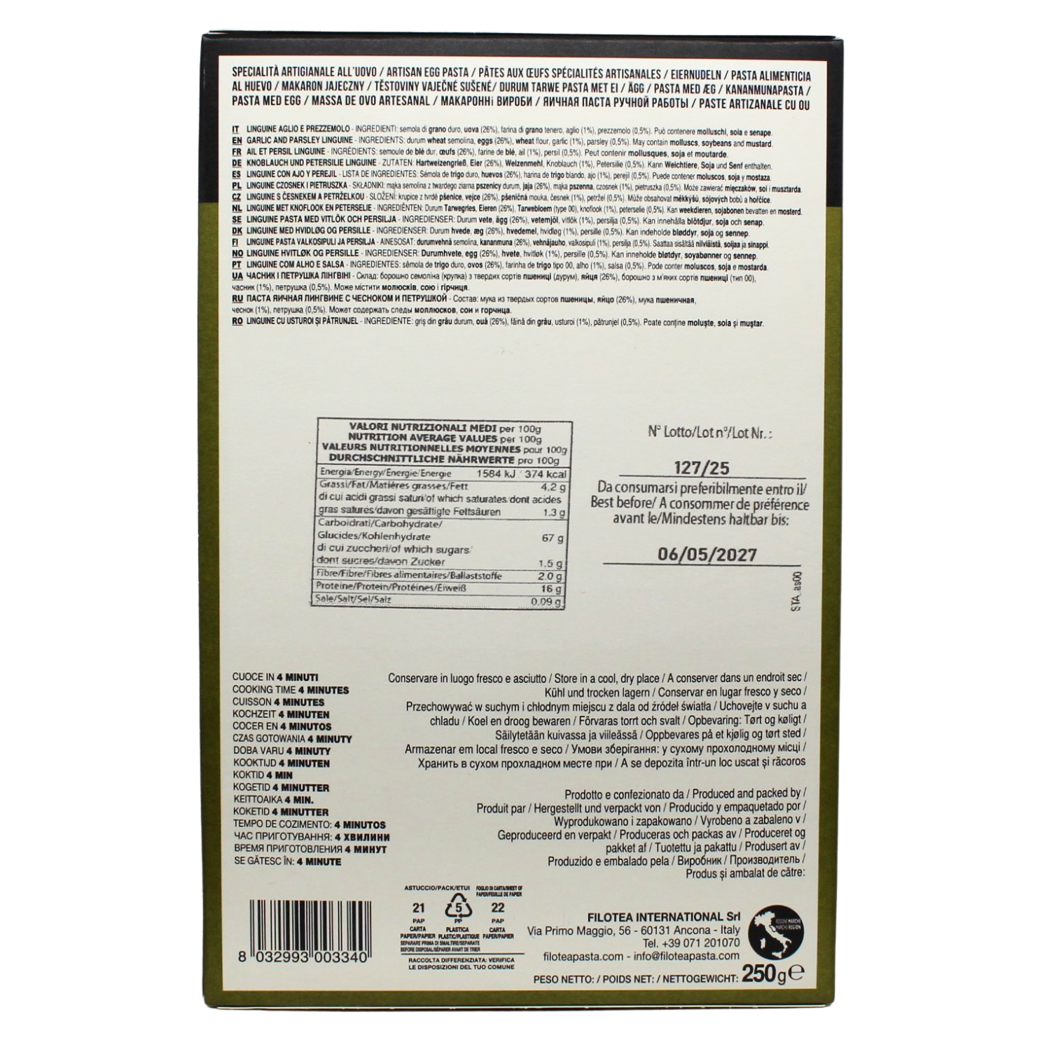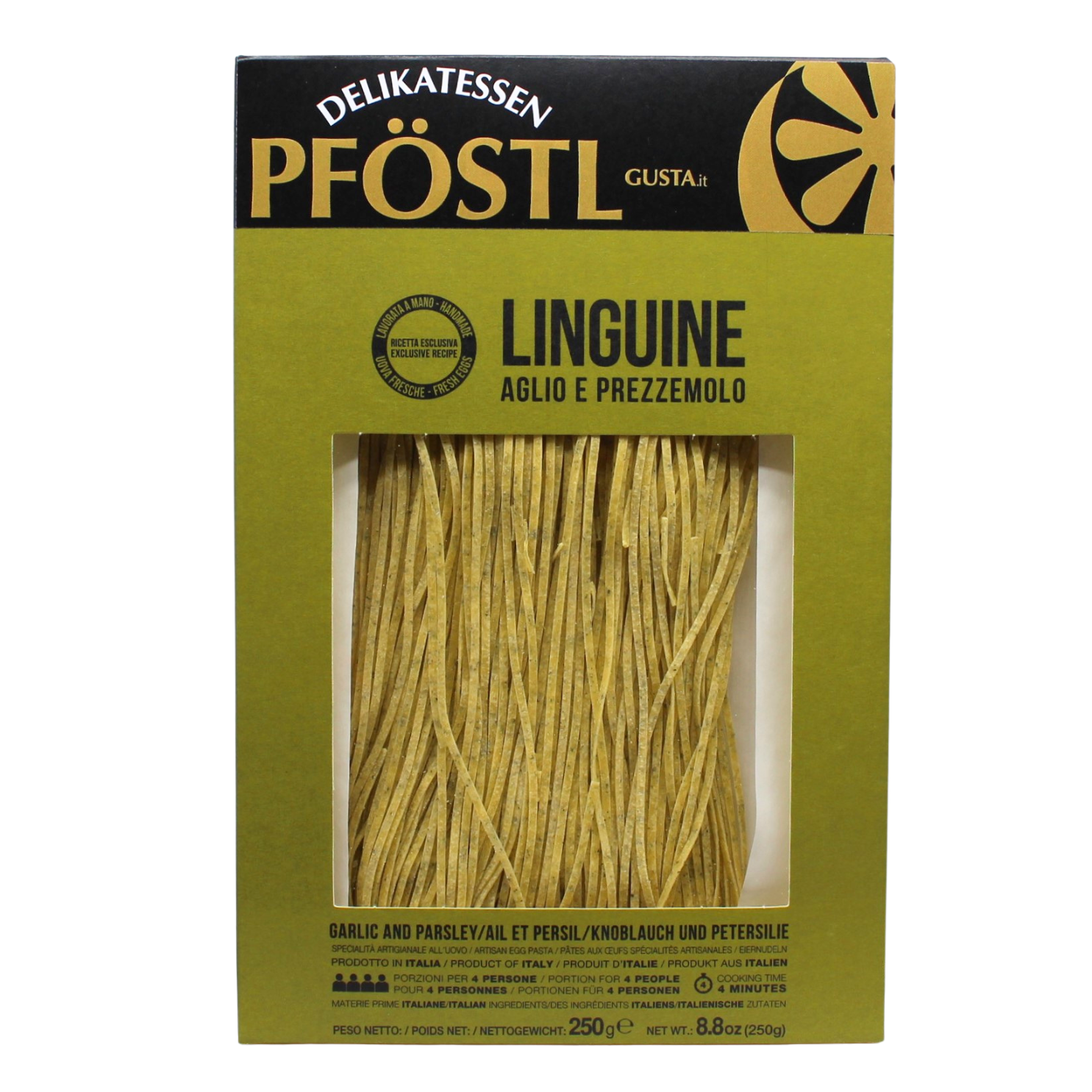 Die Linguine Aglio e Prezzemolo werden in traditioneller Handarbeit hergestellt – ausschließlich mit italienischem Hartweizengrieß, Weichweizenmehl, frischen Eiern (26 %) sowie Knoblauch (1 %) und Petersilie (0,5 %).
