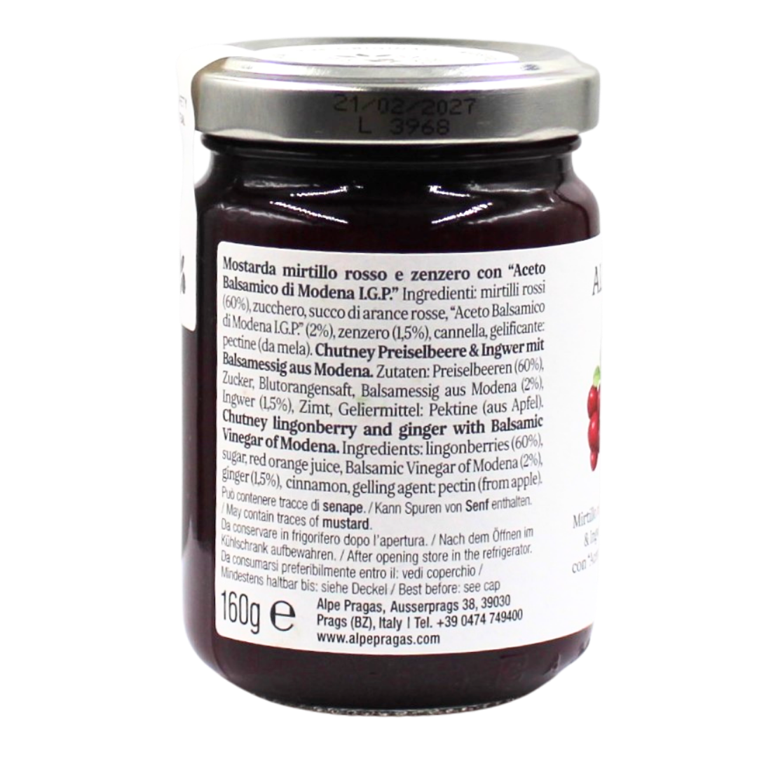 Erleben Sie den unvergleichlichen Genuss unserer Mostarda Preiselbeere mit Ingwer und Balsamessig aus Modena. Diese exquisite Fruchtspezialität wird von Alpe Pragas mit größter Sorgfalt hergestellt und vereint die Aromen vollreifer Preiselbeeren, frischem Ingwer, einem Hauch Orangensaft und einer dezenten Prise Zimt, alles harmonisch abgerundet mit fassgelagertem Balsamessig aus Modena.