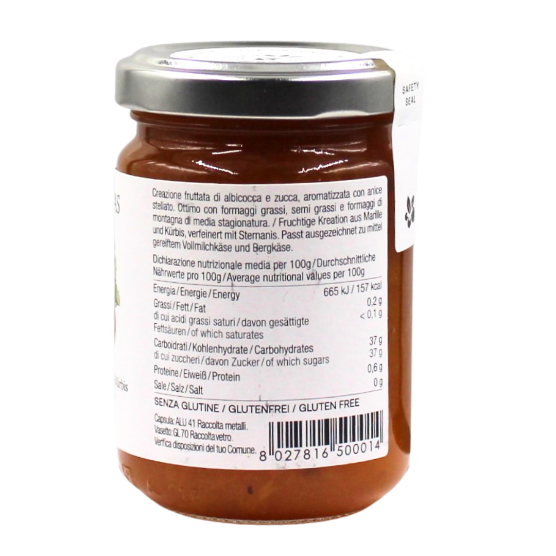 - Zutaten: Marillen (32%), Zucker, Kürbis (21%), Apfelessig, Zwiebel, Sternanis, Chili, Gewürze, Geliermittel: Pektine (aus Apfel).