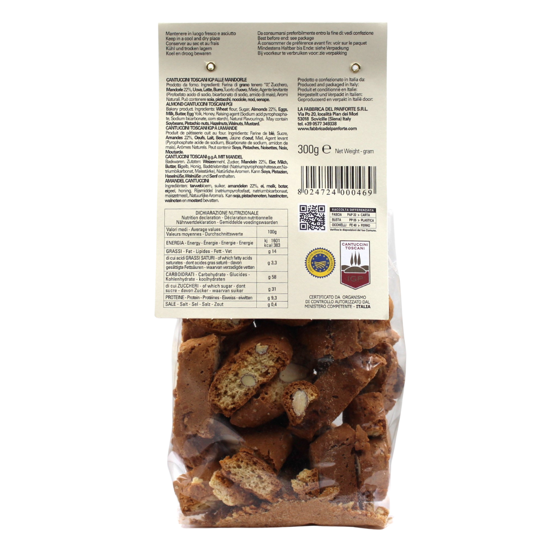 Die "Cantuccini" sind ein typisches Gebäck aus Siena, Toskana. Sie werden aus ganz einfachen Zutaten hergestellt: Weizenmehl, Zucker, Mandeln, Eier, Milch , Butter, Honig, Salz und Aromen, danach leicht angetostet. Dieses Knuspergebäck kann man alleine oder ausgezeichnet mit einem Glas Vin Santo geniessen. Seid Anfang der 90er hat die Konditorei Antichi Dolci di siena wieder die alten Traditionen aufgegriefen und angefangen dieses vergessene Produkt herzustellen.