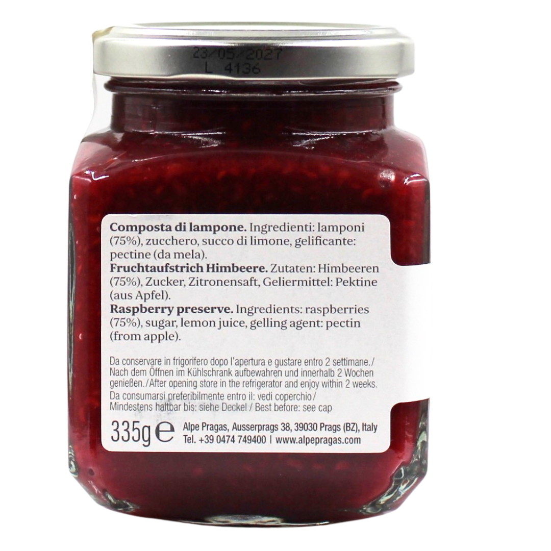 Produktinformationen "Fruchtaufstrich Himbeere 335g Alpe Pragas"