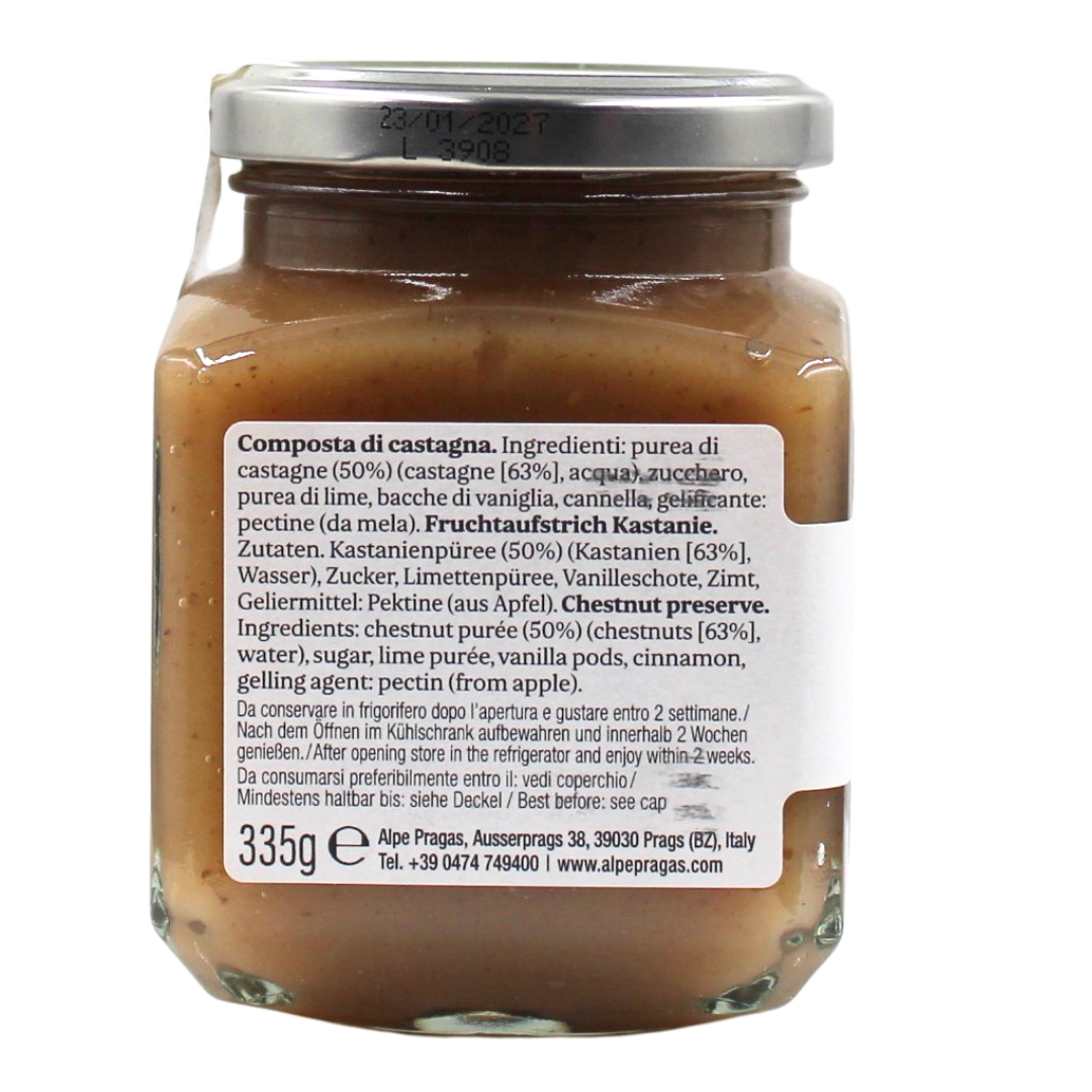 Der Kastanien-Fruchtaufstrich von Alpe Pragas bringt den Geschmack des Herbstes direkt auf den Tisch. Mit seinem hohen Fruchtanteil und der Herstellung ohne Farb-, Konservierungs- und künstliche Zusatzstoffe bewahrt er den puren, natürlichen Geschmack der Edelkastanie. Durch den geringen Zucker- und Kaloriengehalt ist der Aufstrich nicht nur besonders fruchtig, sondern auch eine leichtere Alternative.